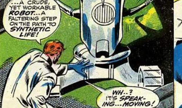 Ultron’s origin in the comics is a bit convoluted: He first shows up as a masked mystery-villain, then reveals himself to be a humanoid robot, then reveals that he’s a self-improving, artificially-intelligent machine that originated as an early stab at sentient robotics by Dr. Pym that went nuts (Oedipus Complex – he hates his “father” and is obsessed with Pym’s then-girlfriend Janet Van Dyne aka “The Wasp”) and ran off to go become evil.